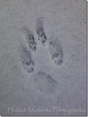 We walked in a skiff of snow on Monday. This paw print was HUGE. At first we were all, “Is that a BEAR print?” But it isn’t because black bears, surprisingly, have 5 toes. I think it was from a large coyote…..I hope.